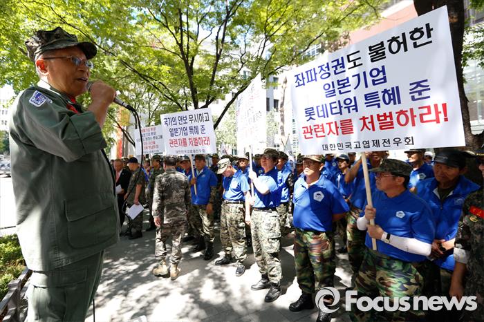 (서울=포커스뉴스) 대한민국고엽제전우회 주최로 진행된 ‘롯데규탄집회’가 27일 낮 12시 30분 서울 을지로 롯데호텔서울 건너편에서 처음 진행됐다.