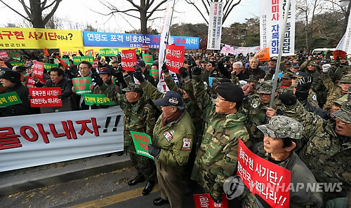 26일 오후 서울 송파구에 위치한 천주교 정의구현사제단 사무실 앞에 모인 대한민국재향군인회와 호국보훈안보단체연합회 소속 회원들이 지난 22일 시국미사에서 연평도 포격과 천안함 사건에 대한 소신을 밝힌 천주교 정의구현사제단 전주교구 신부를 규탄하는 집회를 열고 있다.