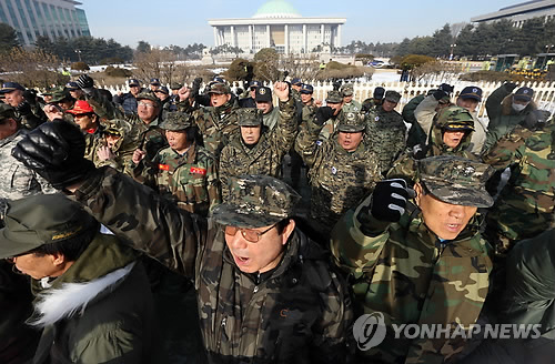 17일 오전 국회 정문 앞에서 대한민국고엽제전우회 주최로 열린 국정원 강화 촉구 기자회견에서 참석자들이 구호를 외치고 있다.