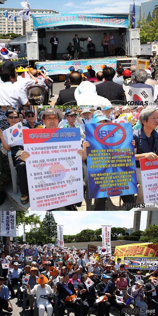 6·25전쟁 발발 직후 이승만 정부가 일본으로 망명을 요청했다는 KBS 보도에 대한 애국진영의 반발과 규탄집회가 연일 계속되고 있는 가운데 16일 오후 여의도 KBS 앞에서 애국단체총협의회(상임의장 이상훈, 집행위원장 박정수) 등 30여 애국 및 시민단체가 ‘노조방송 KBS 개혁 위한 국민대회’를 열었다