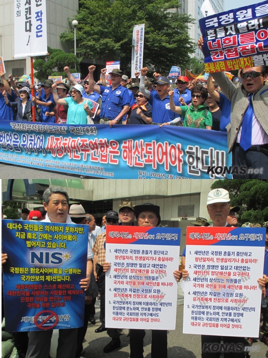 이상훈 애국단체총협의회 상임의장은 이날 “현 정부 들어 검찰의 국정원 조사만 벌서 3번째”라며, “진정한 야당이라면 정보수집 관련 예산을 증액하고 사이버 요원을 요구해야 함에도 새정치민주연합은 국정원 무력화를 시도하고 있다”고 비난하고, 국민의 인권을 이유로 국회에서 낮잠 자고 있는 대테러 방지법을 빨리 통과시키라고 촉구했다.