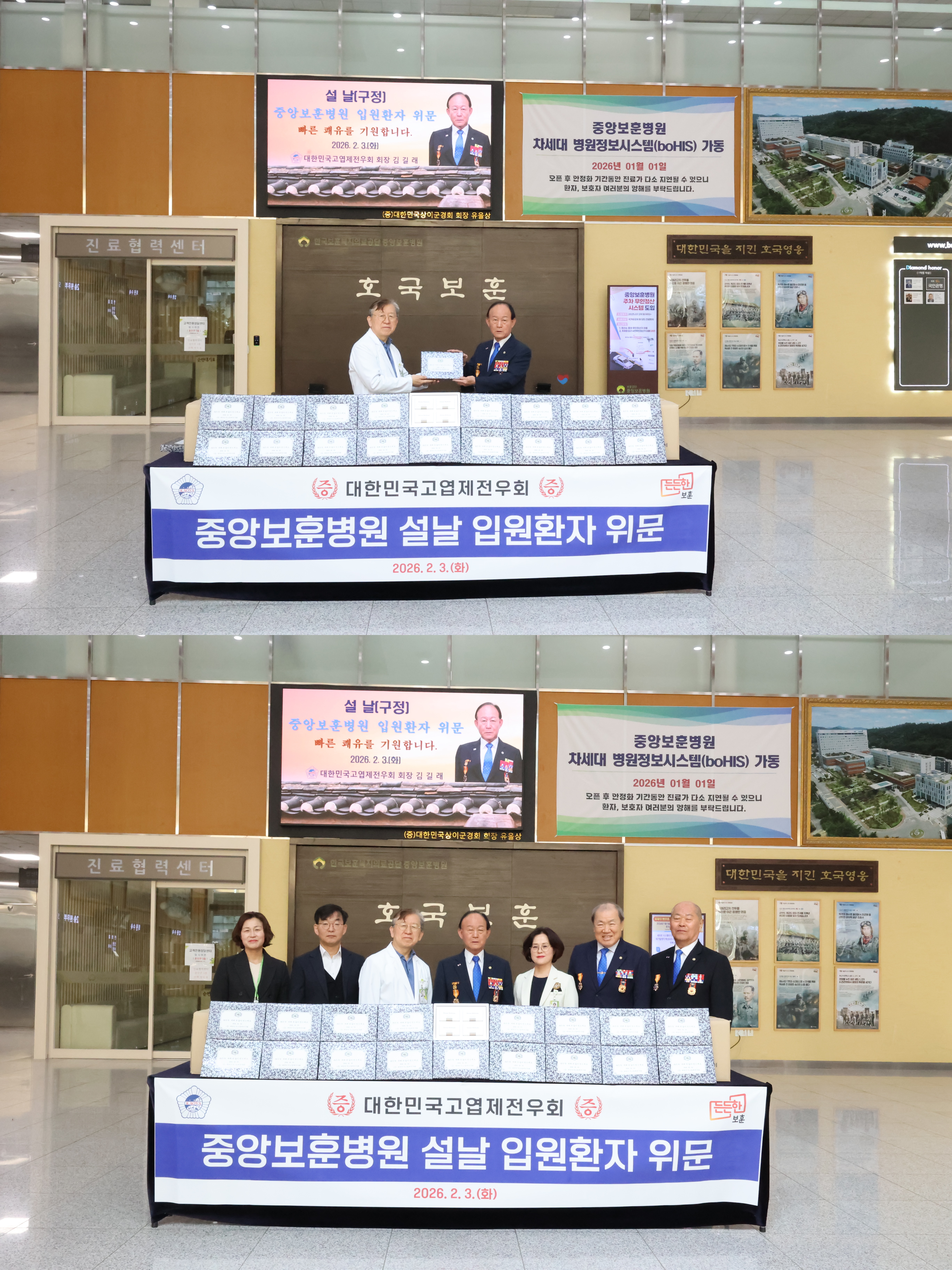 대한민국고엽제전우회(회장 김길래)는 2026년 2월 3일(화) 설명절을 맞이하여 국가유공자 및 고엽제 환우들의 조속한 쾌유를 기원하고자 중앙보훈병원 및 대전보훈병원을 방문하였다.